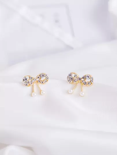 人造珍珠蝴蝶結裝飾耳釘 - 金黃色 - 查看 1