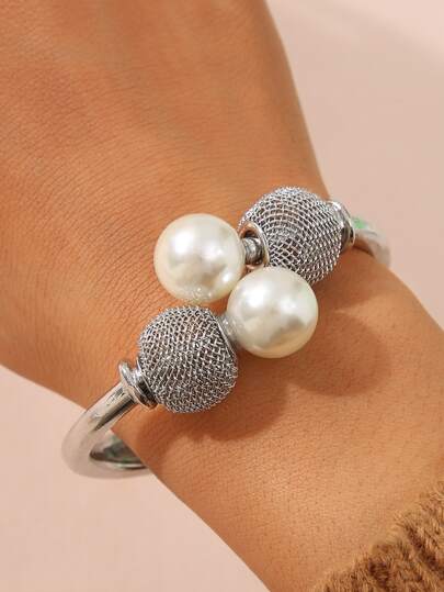 人造珍珠裝飾手鐲 - 銀色 - 查看 1