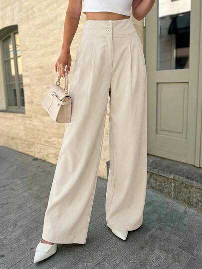 Firerie 女士优雅休闲阔腿裤,杏色纯色高腰褶裥宽松长裤,时尚百搭,新款春夏裤装,度假裤 - 杏色 - 查看 1