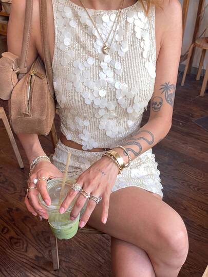 Firerie 女士新款优雅简约杏色亮片圆领无袖修身背心和低腰紧身迷你裙,适合女士生日服装、外出服装和俱乐部服装