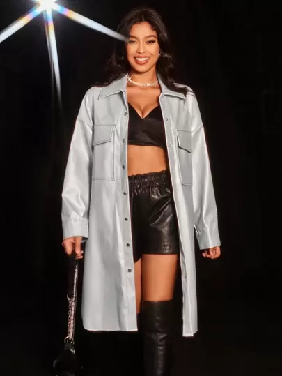 Aveloria 翻蓋口袋落肩袖PU皮革外套 - 銀色 - 查看 1