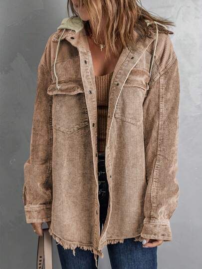 CILKOO 抽绳连帽灯芯绒夹克,毛边下摆,落肩设计,带翻盖口袋 - 棕色 - 查看 1