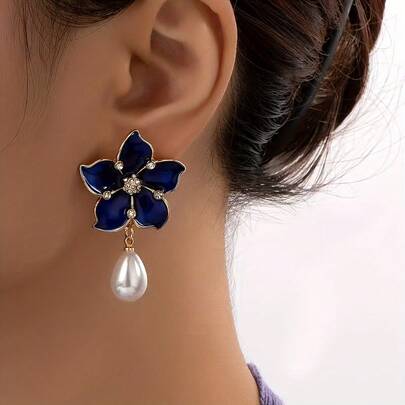花朵与仿珍珠耳环,优雅精致,适合女性佩戴,可用于正式场合和日常佩戴,复古风格 - 藍色 - 查看 1