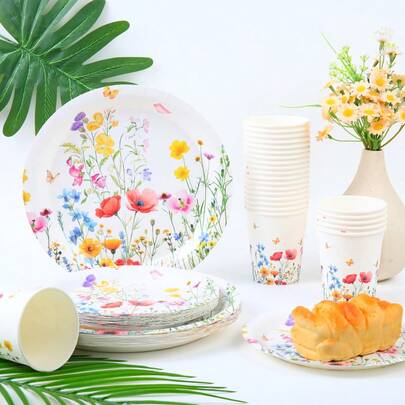 花卉图案一次性餐具套装,7/9英寸派对餐盘,一次性纸盘和纸杯,适用于节日、婚礼、订婚、生日、派对、庆祝活动 - 彩色 - 查看 1