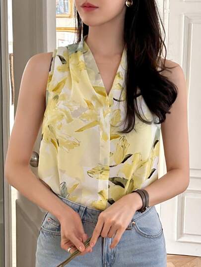 DAZY 花卉印花纽扣前无袖衬衫,无袖上衣,外出上衣 - 彩色 - 查看 1