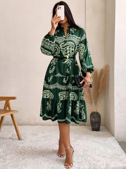 SHEIN Clasi 印花燈籠袖多層下擺娃娃裙不附腰帶 - 綠色 - 查看 1