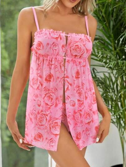 印花網紗吊帶睡裙附丁字褲 - 淺粉色 - 查看 1