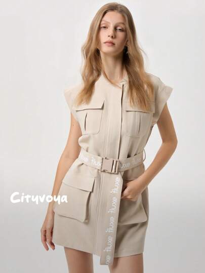 Fluxe 女式休闲纯色梭织工装口袋迷你连衣裙 - 卡其色 - 查看 1