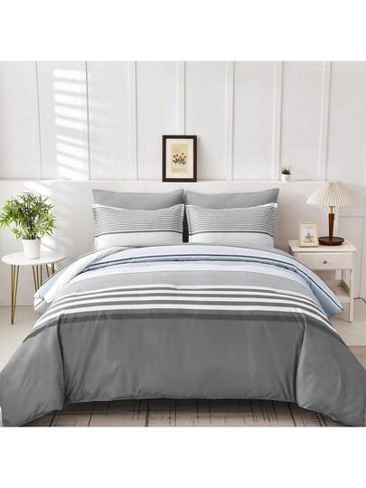 Fondream Grey Stripe Duvet Cover Double Reversible Bedding Set Soft Microfiber Bedding Cover With Pillow Cases (Double Size,3Pcs) - 灰色條紋 - 查看 1