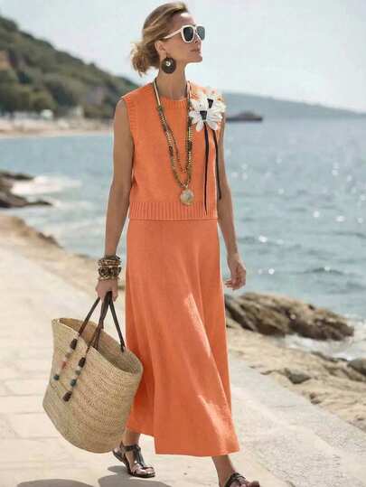Franclia 秋冬新款宽松碎花圆领无袖针织背心搭配碎花灰色A字针织中长裙,女士两件套毛衣套装
