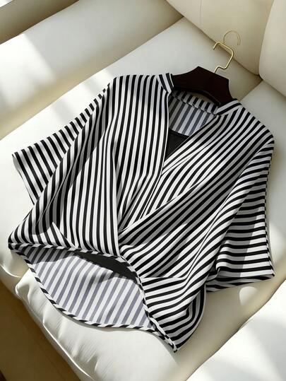 Franclia 女士休闲V领无袖两用条纹针织背心,带前袋褶裥,优雅春夏上衣 - 黑與白 - 查看 7
