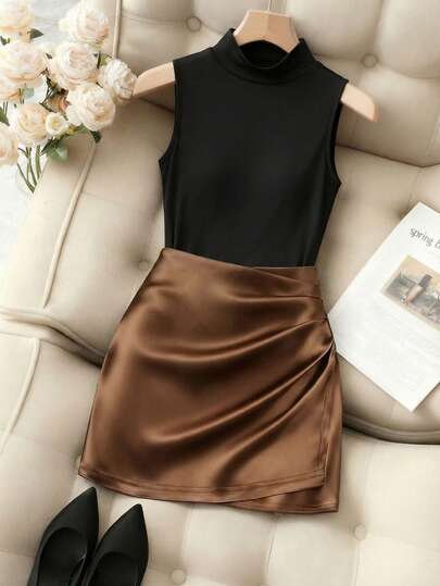 Franclia 时尚高领无袖修身背心 + 时尚不对称亮面百褶紧身迷你裙,高腰修身百褶性感女士两件套,春夏款 - 棕色 - 查看 1