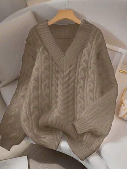 Franclia 全新宽松柔软甜美粉色休闲设计 V 领粗针织套头衫,适合女士,百搭 - 棕色 - 查看 1