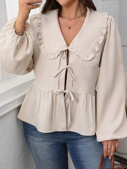 Flirla 大码女式复古彼得潘领拼布荷叶边蝴蝶袖衬衫,通勤装,春/秋/冬 - 杏色 - 查看 1