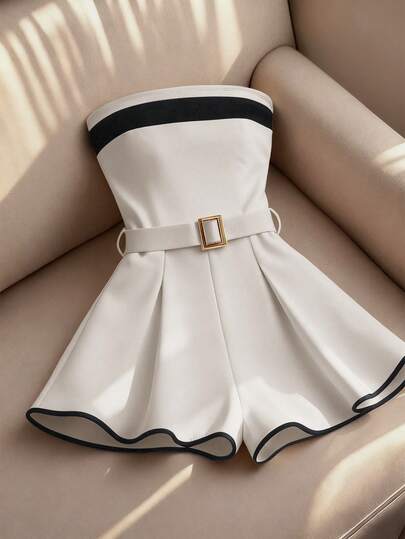 Franclia 夏季抹胸连体裤,金属扣腰带,休闲百搭 - 杏色 - 查看 1