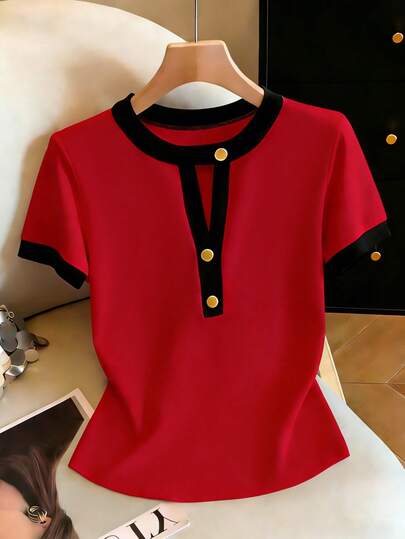 Franclia 女士新款圆领撞色滚边半开襟金属纽扣短袖修身露脐上衣,可爱红色上衣,红色女式衬衫,红色女式上衣,红黑复古女式上衣,女士短袖上衣,女士上衣和衬衫,女士Polo衫,女士休闲工作上衣,女士上衣