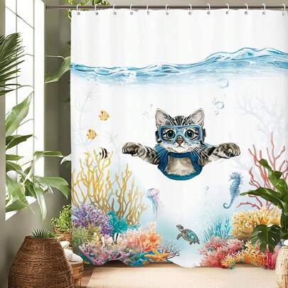 趣味猫咪图案浴帘,蓝色海底海洋主题浴室装饰浴帘套装(含挂钩),趣味海洋动物图案家居装饰浴帘 - A - 查看 1