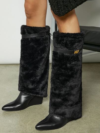 毛茸茸及膝帶扣細節靴子 - 黑色 - 查看 4