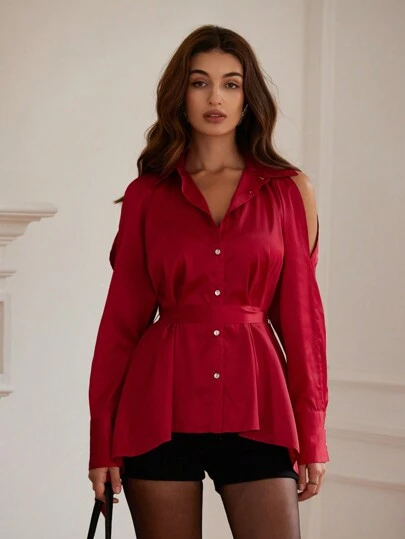 GENKIRA 法式优雅精致露肩女式上衣,配腰带,迷人面料,秋季假日派对服装 - 紅色 - 查看 1
