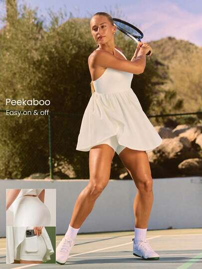 GLOWMODE 自信满满,内置胸垫,超高腰,后背扭结设计,侧开衩下摆,内置短裤,侧边口袋,防滑设计,圆领娃娃衫连衣裙,日常休闲装 - 白色 - 查看 10