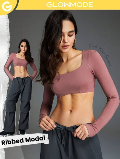 GLOWMODE 掐緊彈性純淨素面方領長袖極短時尚上衣,帶拇指孔 - 藕粉色 - 查看 1
