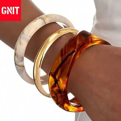 GNIT 爆款复古手链套装 Y2K美学手饰 女士热销可叠戴手链套装 琥珀大理石黄金三件套奢华首饰 - 扭透咖+金細圓+米中圓 - 查看 3