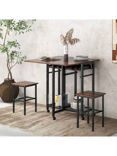 GOFLAME 3 PCS Foldable Dining Table And Chair Set, Rectangle Kitchen Table With Expandable Top, 6-Bottle Wine Rack, Shelves, Mobile Breakfast Table Set With Push Handle And Wheels, Rustic Brown - 棕色 - 查看 1
