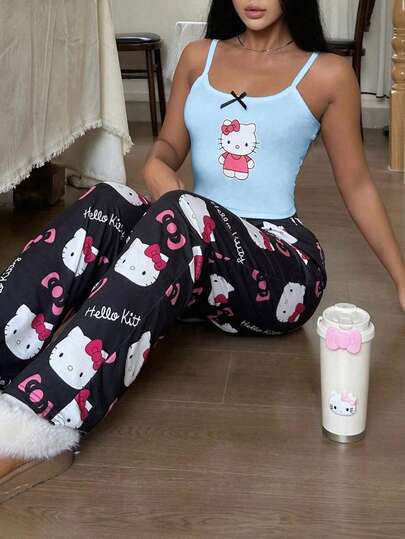 Sanrio 【奇幻世界】2件套Hello Kitty印花女士吊带露脐上衣+弹力腰直筒裤可爱睡衣套装 - 淺藍色 - 查看 1