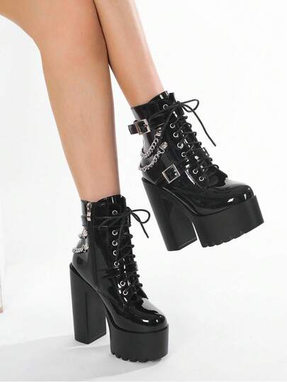 Gdgydh 哥特风女鞋,时尚金属链条粗跟踝靴,带拉链厚底高跟鞋,圆头女士夜店角色扮演鞋,春秋季黑色万圣节鞋 - 黑色 - 查看 1