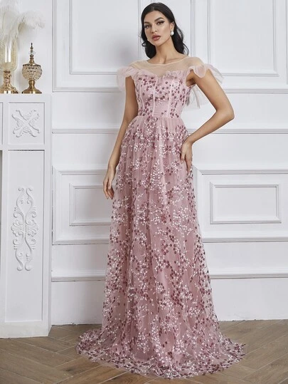Giffniseti 拼接花卉刺繡網紗荷葉邊亮片舞會洋裝 - 藕粉色 - 查看 1