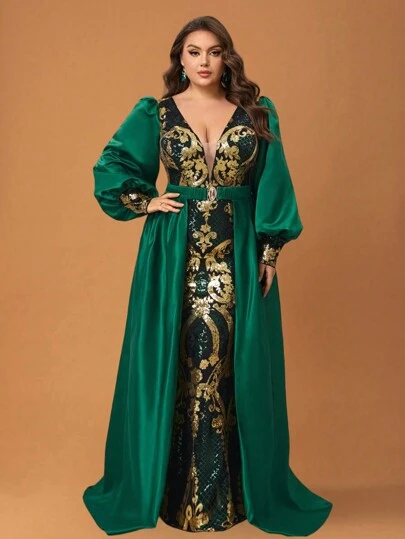 YISIKADO 大码波西米亚风花卉亮片性感深 V 领腰带可拆卸下摆晚礼服派对晚宴舞会礼服女式长裙 - 彩色 - 查看 1