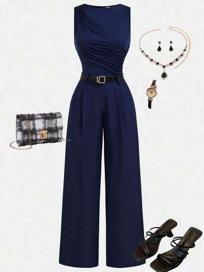 Girlism 青少年女孩紧身衣和连体裤海军蓝褶皱宽腿宽松连体裤配腰带,休闲风格, - 藏蓝色 - 查看 1