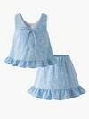两件套女童休闲套装 - 纯色蝴蝶结装饰短袖上衣和蝴蝶印花仿牛仔图案裤子,夏季