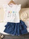 SHEIN 青少年女孩休闲简约赛车运动服“洛杉矶”79 图案印花条纹短袖 T 恤和短裤套装,适合夏季