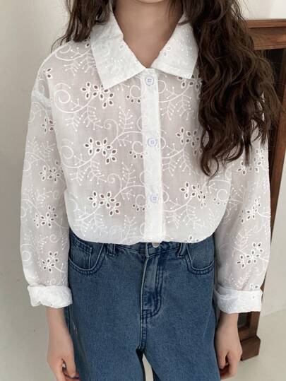 Dazy Kids 青少年女孩秋季翻领长袖衬衫,返校服装 - 白色 - 查看 1