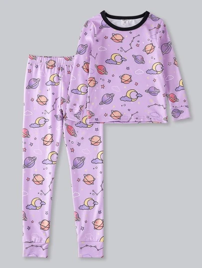 女孩卡通圖案撞色滾邊緊身睡衣套裝 - 紫丁香色 - 查看 1