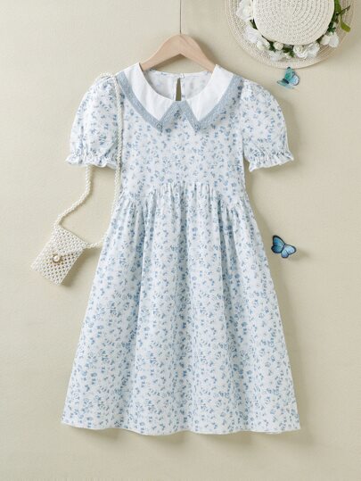 女孩碎花水溶蕾絲拼接泡泡袖洋裝 - 淺藍色 - 查看 1