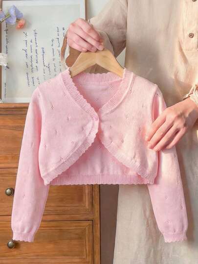 女童优雅粉色短款镂空针织开衫,单扣轻薄透气披肩,春夏款 - 粉色 - 查看 6