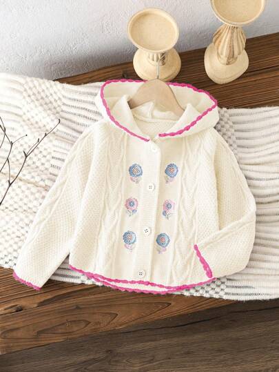 SHEIN 女孩花卉刺绣连帽开衫,复古乡村风格针织夹克 - 米色 - 查看 1