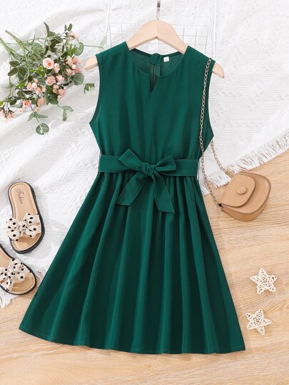 女孩缺口領繫腰帶洋裝 - 墨綠色 - 查看 1