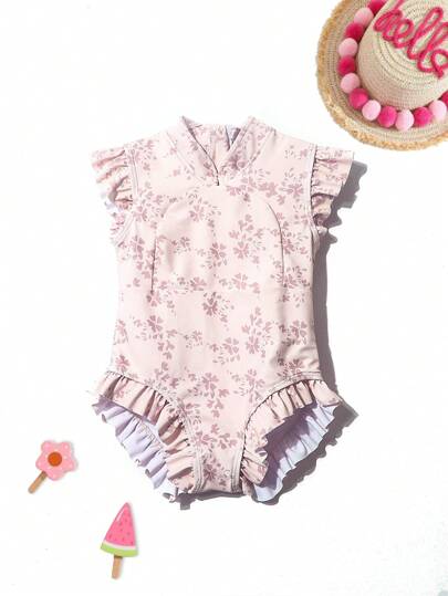 女童连体无袖拉链泳衣,带花卉印花和荷叶边,适合游泳、海滩、夏季 - 粉色 - 查看 1