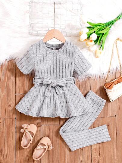 SHEIN 女童春夏時尚舒適短袖上衣配套裝 - 灰色 - 查看 1