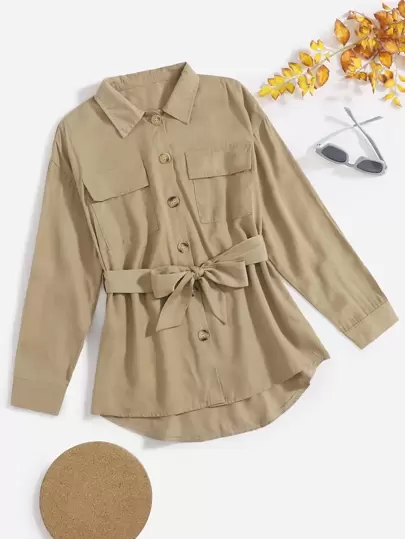 女孩素色前紐扣腰帶風衣外套 - 卡其色 - 查看 2