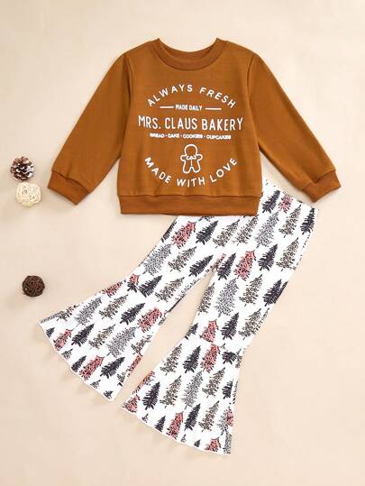 女童春秋休闲户外百搭摩卡字母&姜饼人面包店蛋糕饼干印花长袖圆领上衣搭配白色花卉喇叭裤 - 咖啡棕 - 查看 1