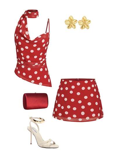 GlowEve 夏季女士红白波点雪纺不对称荷叶边领口上衣和迷你裙两件套 - 紅色 - 查看 1