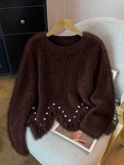 GlowEve 女士不对称下摆流苏仿貂绒柔软舒适手工镶钻修身圆领套头毛衣,常规版型,日常通勤穿着,秋冬季 - 咖啡棕 - 查看 1