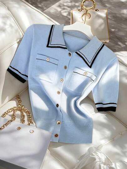 GlowEve 女士翻领撞色滚边短袖双条纹单排扣双口袋开衫 - 彩色 - 查看 6