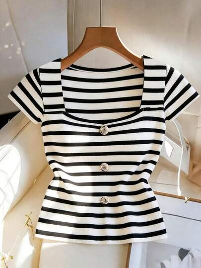 GlowEve 女士法式极简修身条纹针织休闲短袖T恤,春夏款,宽松版型,适合通勤,日常穿着尽显优雅。优雅、休闲、女士休闲、浪漫、约会、时尚休闲通勤装、商务办公装、百搭时尚日常休闲装、都市教师职业装