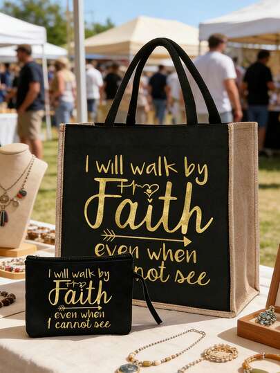 金色字母“我们凭信心而行”手提袋套装,包含便携购物袋和化妆袋,可折叠收纳袋内含小型亚麻化妆包,适合教师、母亲、个人旅行化妆、购物等场合。