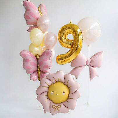 金色数字铝箔气球套装,包含领结和粉色蝴蝶花卉铝箔气球,适合生日派对、周年纪念日,可重复使用,室内/室外摄影道具装饰